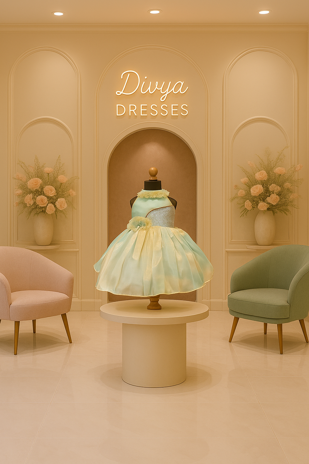 Bright and joyful, this lemon yellow frock features a shimmering fabric with sequin bodice and floral accents. Its vibrant hue and twirling silhouette make it perfect for sunny celebrations and festive gatherings.